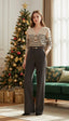 Oversize üst ve geniş paça pantolonuyla modern bir siluet oluşturur.