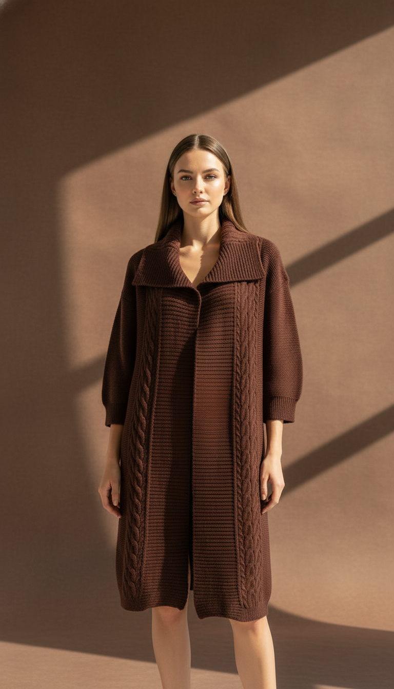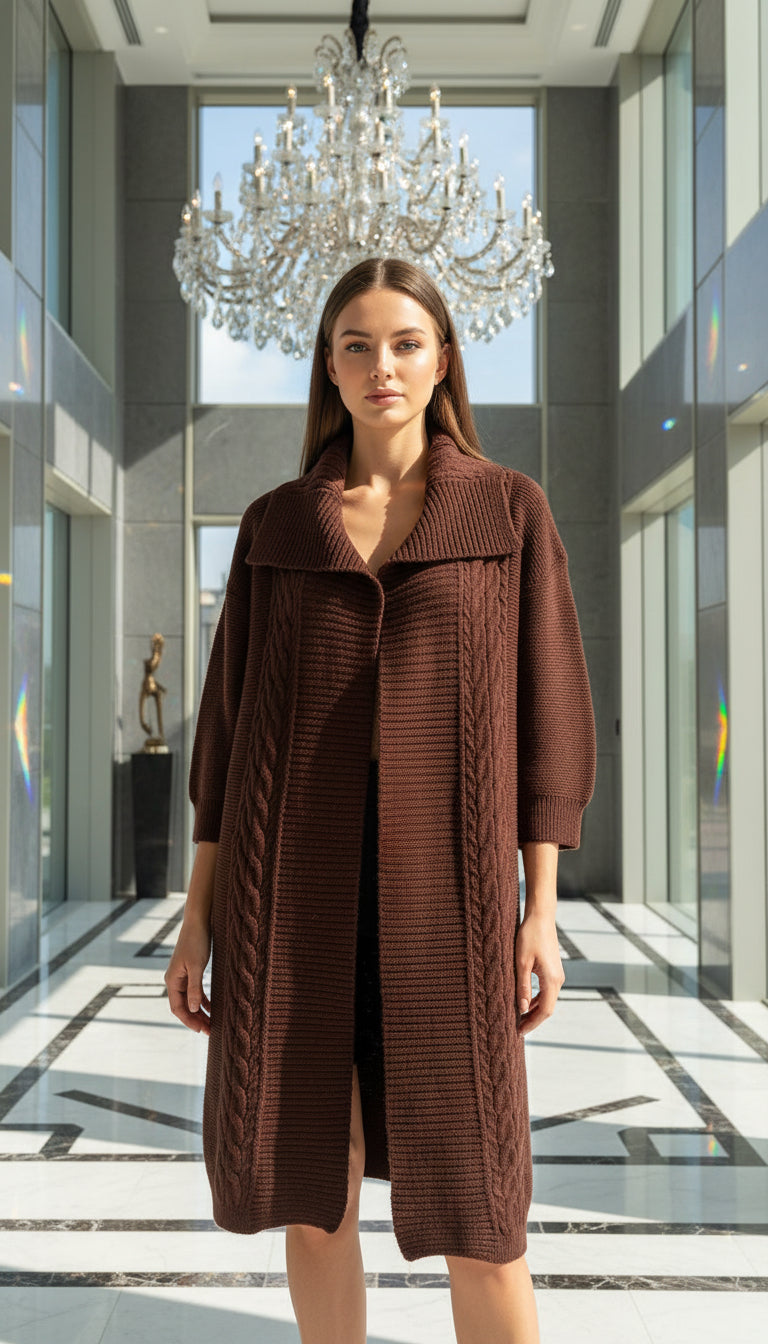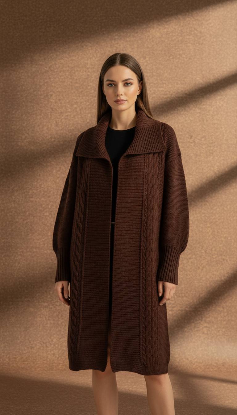 Kalın dokulu premium örgüsü, geniş yaka formu ve diz hizasında şık kesimiyle hem modern hem zamansız bir duruş sunar.