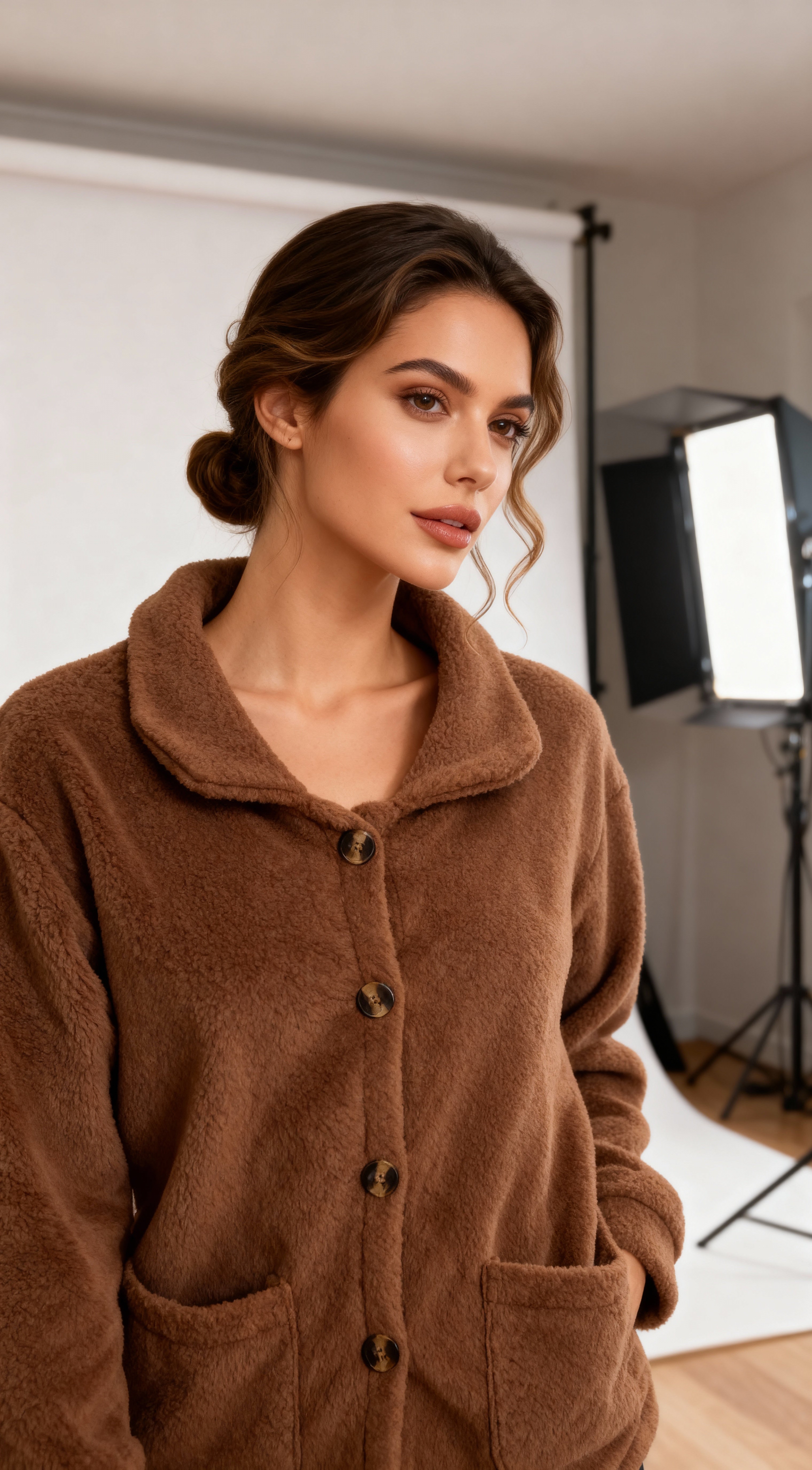 A brown teddy coat with a soft woolly texture and oversized silhouette — combining comfort, elegance, and timeless warmth.