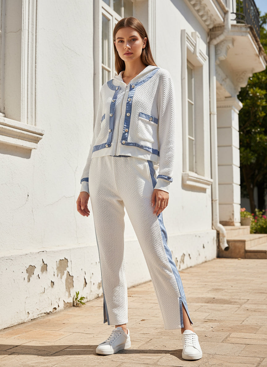 Pamuk Kapitone Kumaş üzerine mavi şeritlerle süslenmiştir .
