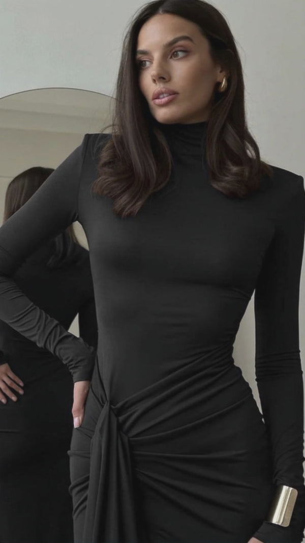 Şıklığın zarafetle buluştuğu ELLE elbise; vücuda oturan silueti, yüksek yırtmacı ve drape detaylarıyla kusursuz bir görünüm sunar. Esnek kumaşı ile hem özel davetlerde hem akşam şıklığında rahatça hareket etmeni sağlar. Minimal ama etkisi büyük bir stil için idealdir.
