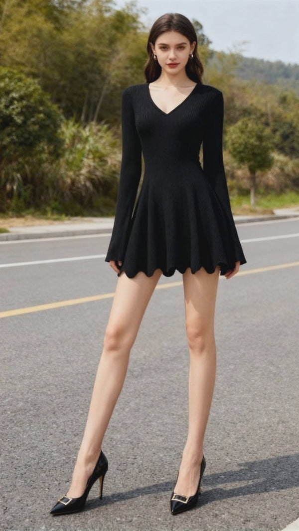 GENDA elbisesi; belden oturan ve aşağı doğru genişleyen formu, zarif V yaka detayı ve dökümlü etek yapısıyla kusursuz bir siluet oluşturur.