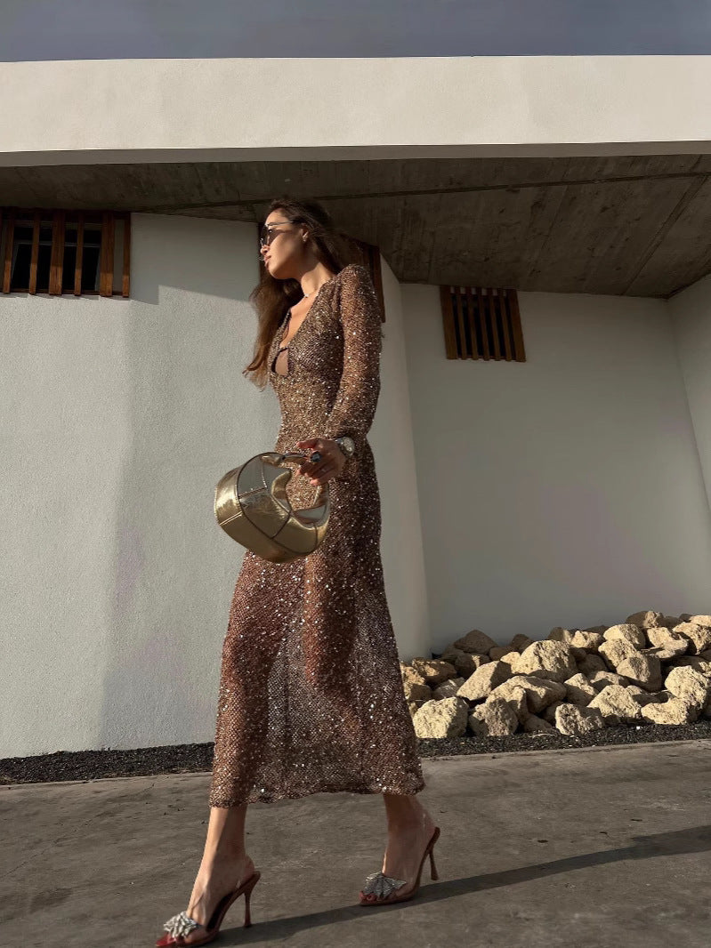 Gonza, ışıltıyı zarafetle buluşturan, özel davet ve akşam organizasyonları için tasarlanmış premium bir file elbisedir.