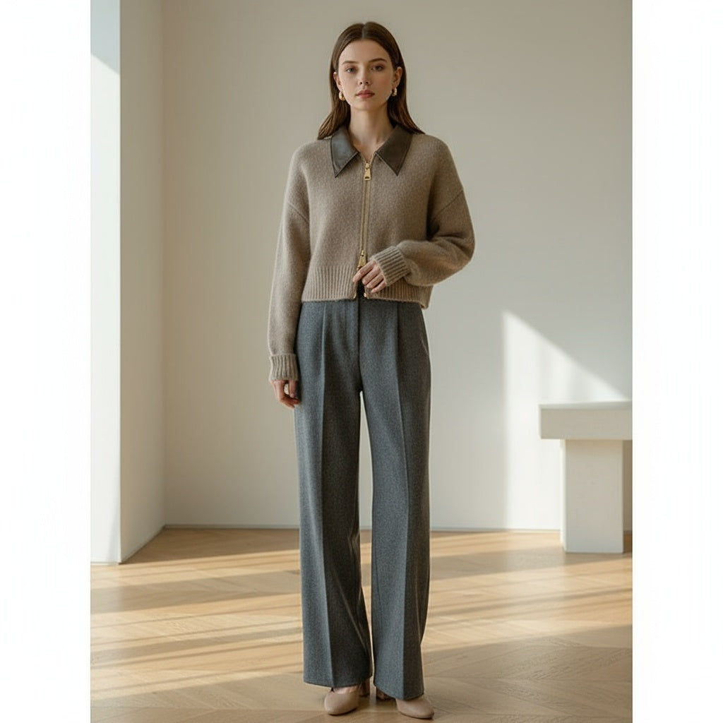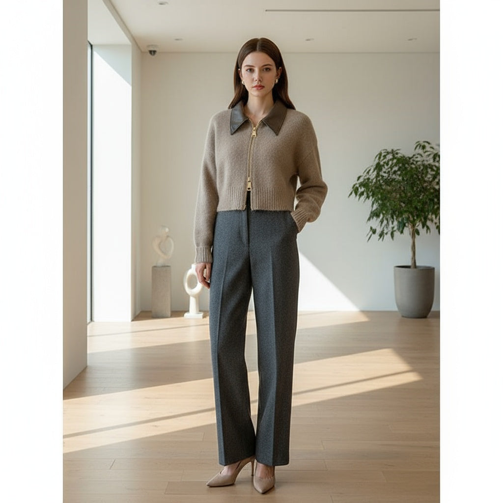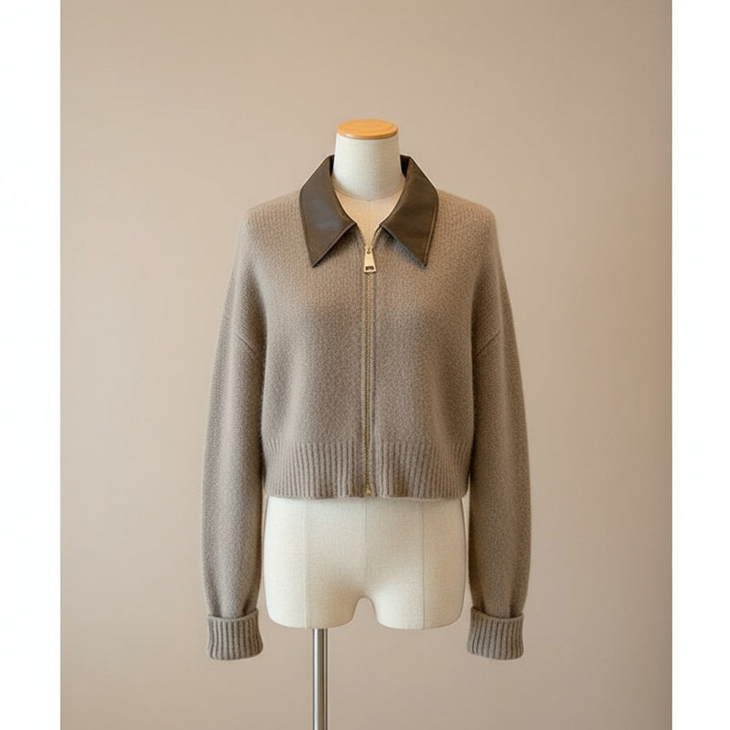A cropped beige mohair cardigan featuring a dark brown leather collar and gold zipper — the perfect harmony of texture and elegance.