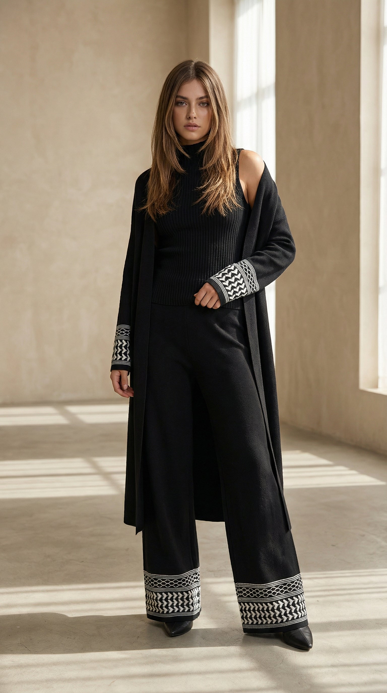 Yüksek bel düz paça pantolonu, boğazlı kolsuz trikoyu ve bileklerinde jakarlı desen detaylı uzun hırkasıyla hem günlük hem de ofis şıklığında rahatlıkla kullanılabilir. Üç parçayı birlikte takım olarak kullanabileceğin gibi, her bir parçayı gardırobundaki diğer parçalarla ayrı ayrı kombinleyebilirsin.