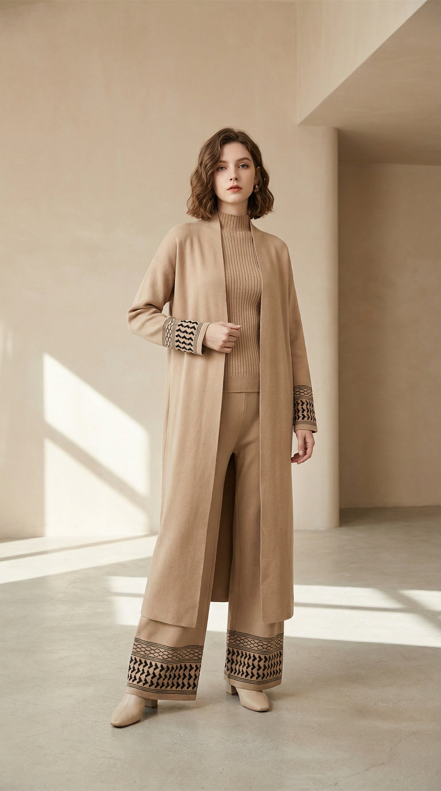 Yüksek bel düz paça pantolonu, boğazlı kolsuz trikoyu ve bileklerinde jakarlı desen detaylı uzun hırkasıyla hem günlük hem de ofis şıklığında rahatlıkla kullanılabilir. Üç parçayı birlikte takım olarak kullanabileceğin gibi, her bir parçayı gardırobundaki diğer parçalarla ayrı ayrı kombinleyebilirsin.