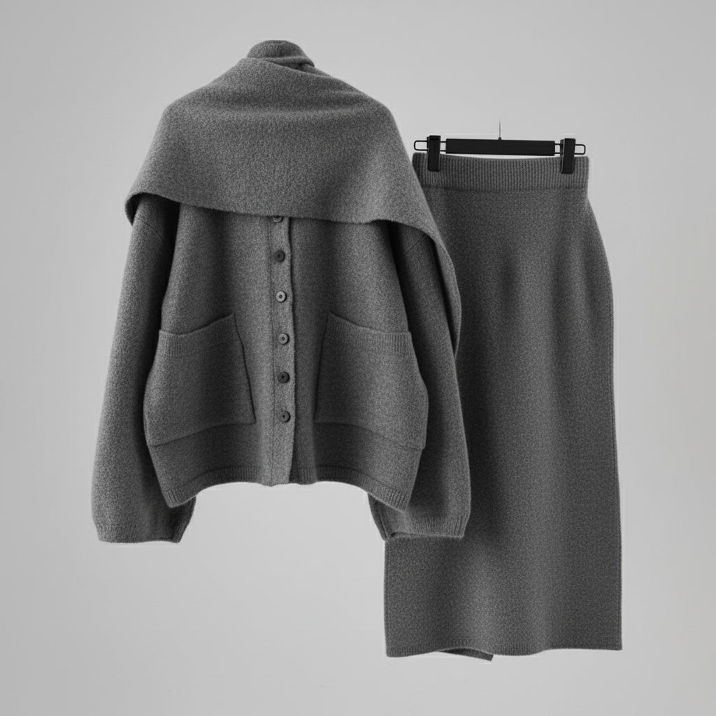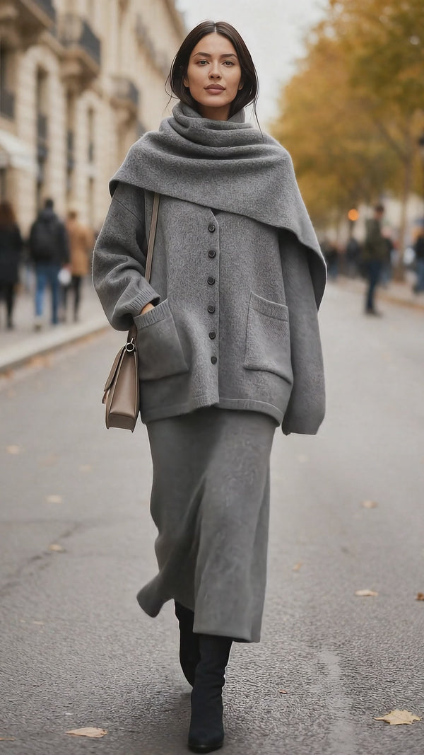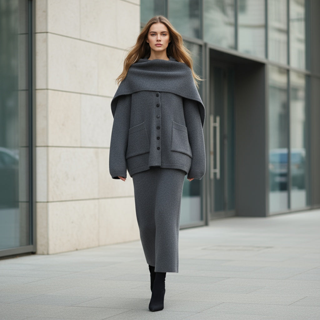 This refined knit set pairs an oversized cardigan with a straight long skirt — soft, structured, and endlessly wearable.
