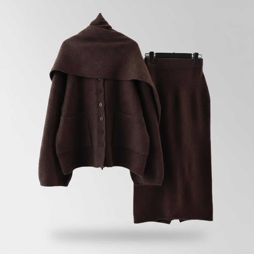 An oversized knit cardigan paired with a long skirt — minimal, natural, and effortlessly refined. Perfect for cozy sophistication.