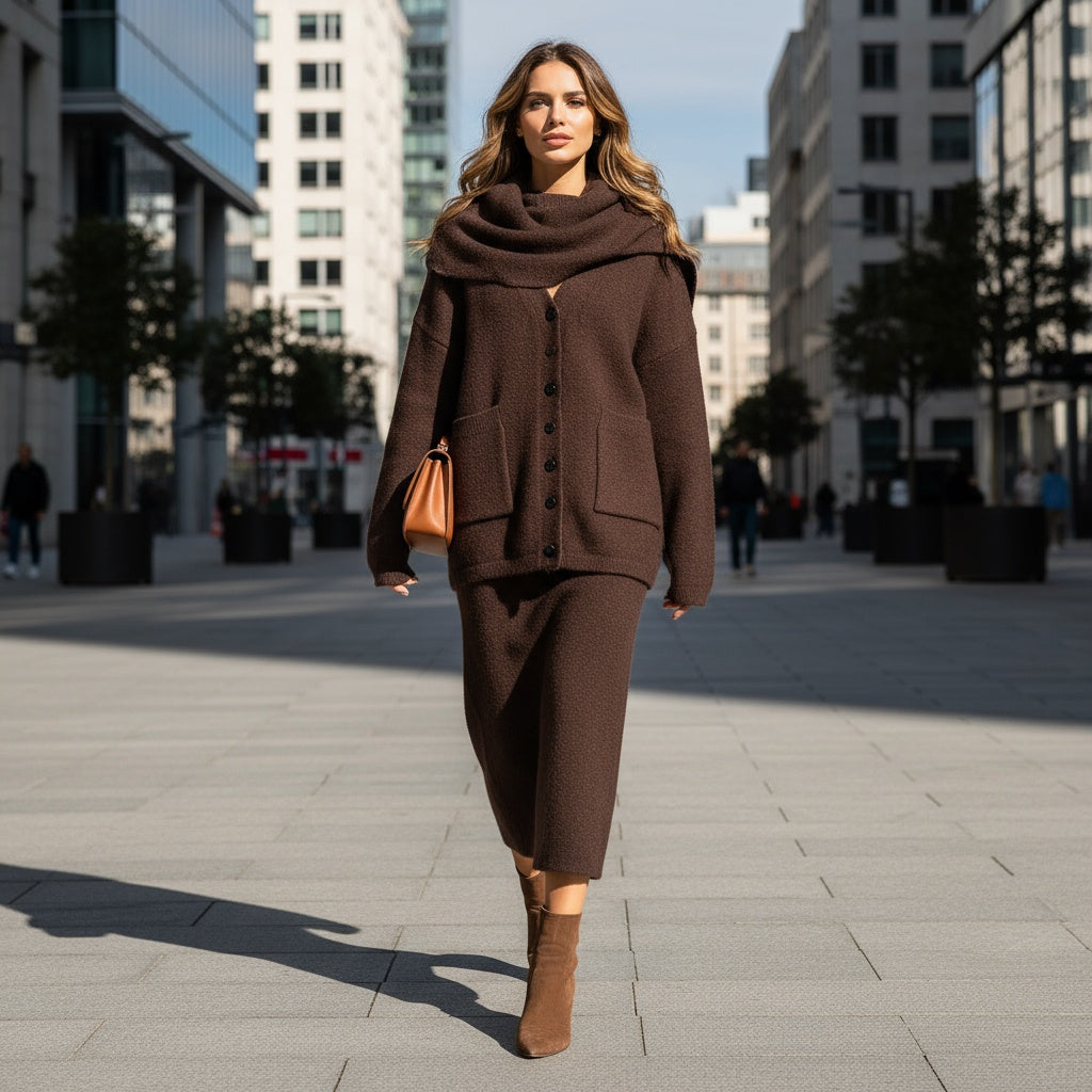 Bu kahverengi örgü takım, yumuşacık dokusuyla hem rahat hem de sofistike bir duruş kazandırır. Oversize kesimli hırka, uzun etekle birleşerek doğal bir akış sağlar. Gün boyu konforu korurken, stilinden ödün vermeyen kadınlar için tasarlandı.