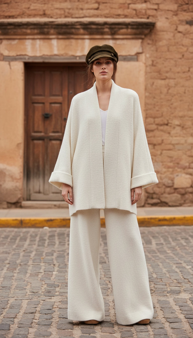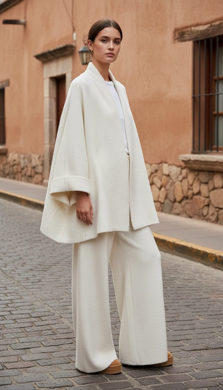 Salaş kesim kazak ve geniş paça pantolonun modern uyumu sayesinde hem şehir stiline hem ev rahatlığına uyum sağlar.