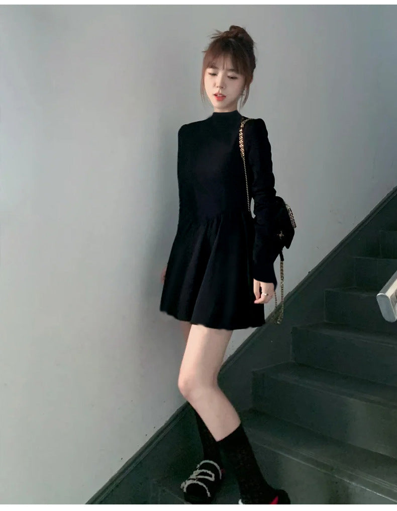 Yüksek yaka detayı, uzun kolları ve kloş etek formu ile hem zarif hem de feminen bir duruş sunar.