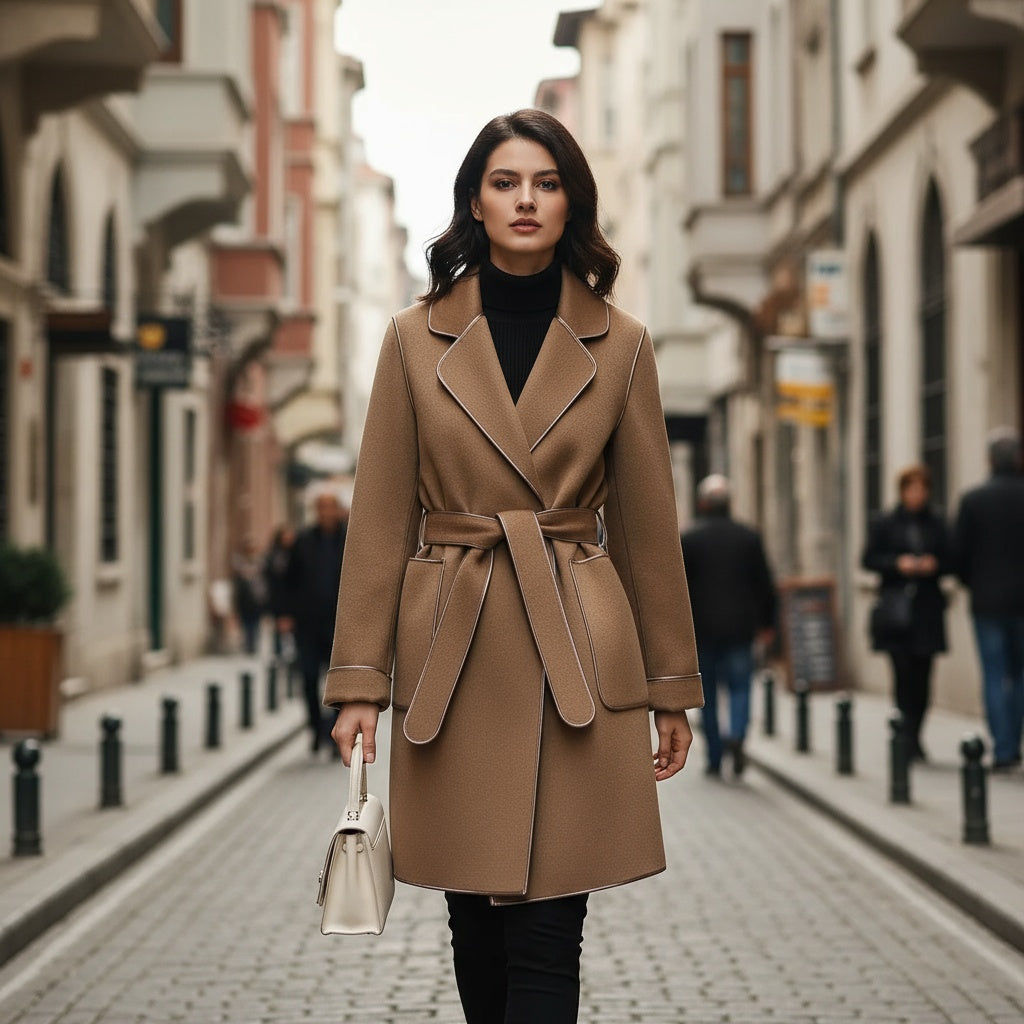 A camel wool coat with cream piping and a belted waist — refined, versatile, and effortlessly chic for city elegance.