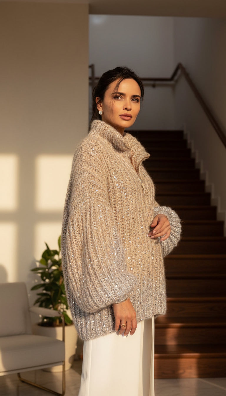 | MODEL ÖZELLİKLERİ : Kışlıktır. Fermuarlıdır. Oversizedır. İpliğinde pullar bulunur |