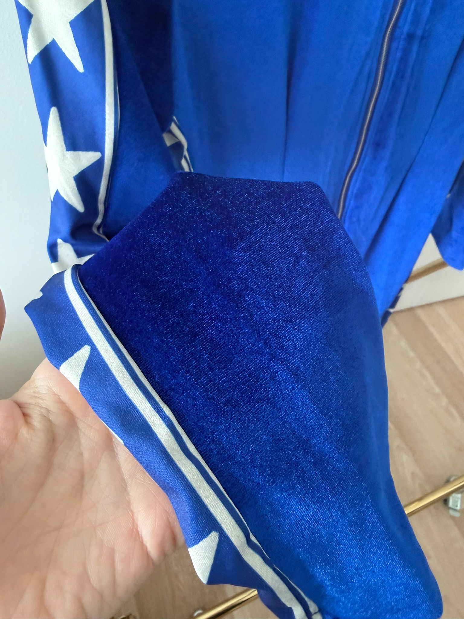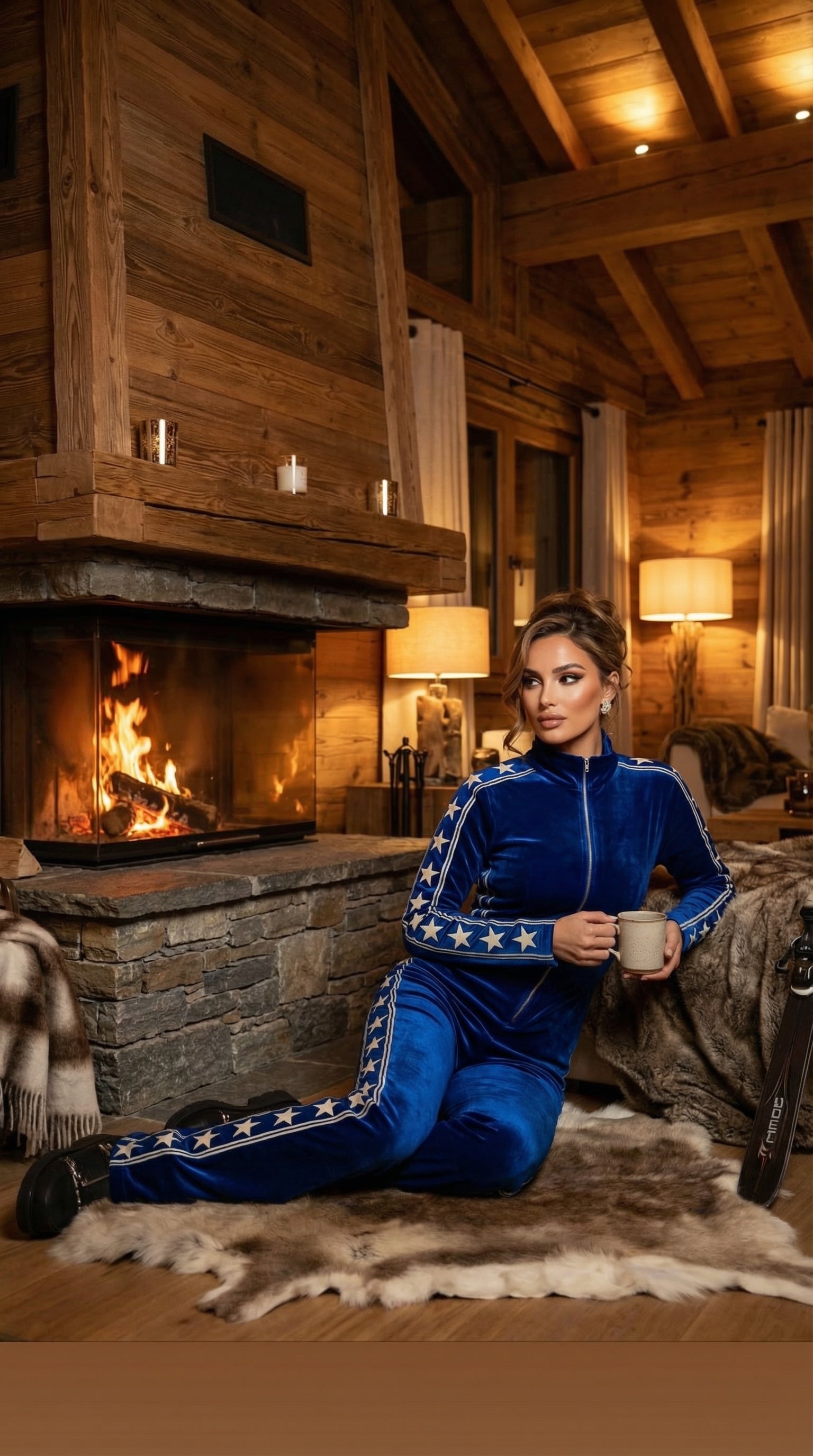 Après-ski stilinden ilham alan bu kadife tulum, fonksiyonel spor giyimden ziyade stil ve görünüm odaklı bir tasarımdır. Yumuşak kadife dokusu, vücudu saran fit kalıbı ve yanlardaki yıldız şerit detaylarıyla güçlü, iddialı ve dikkat çekici bir silüet sunar.